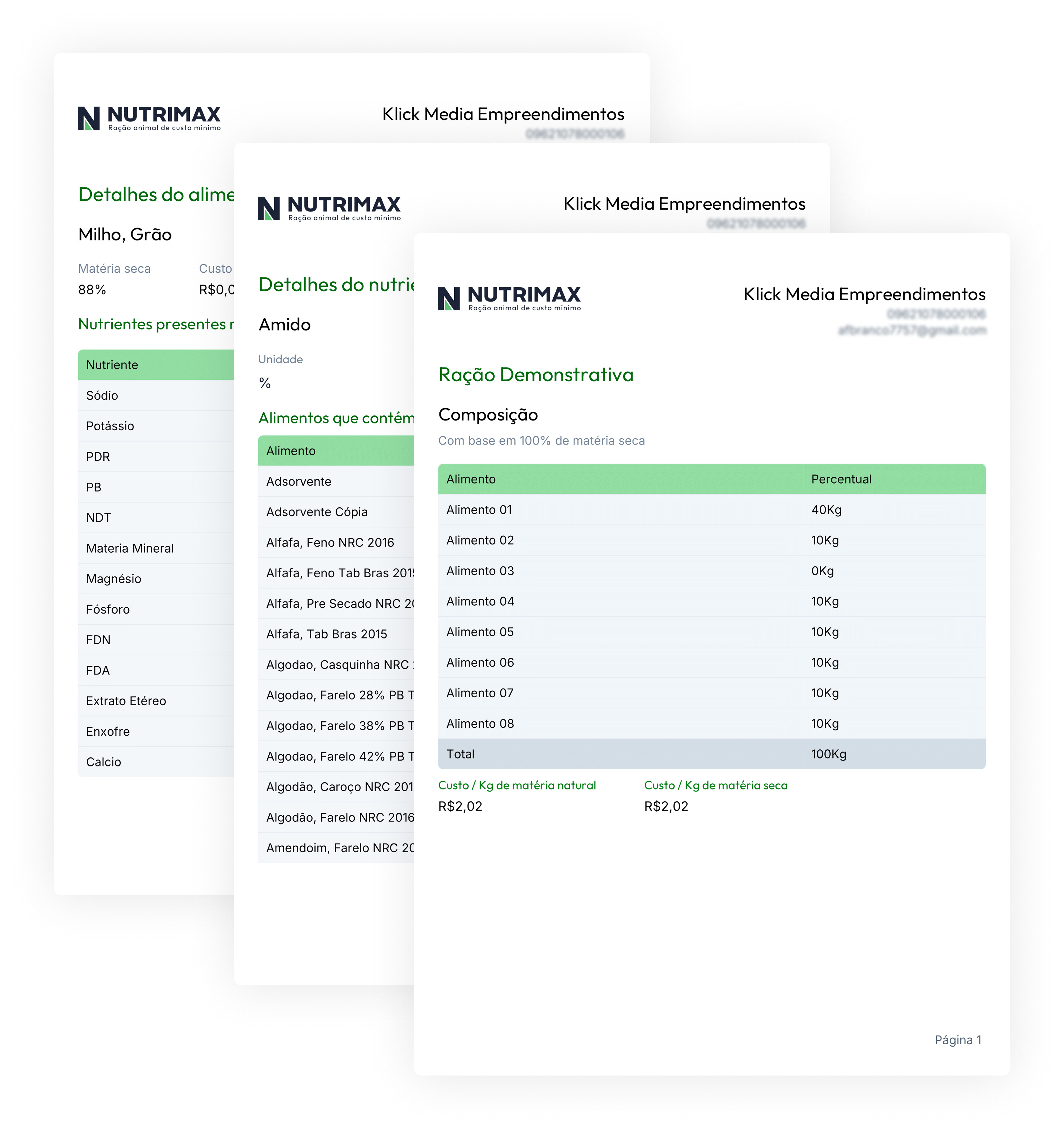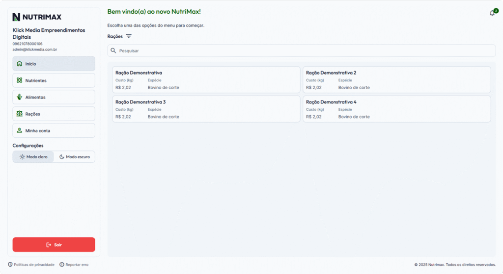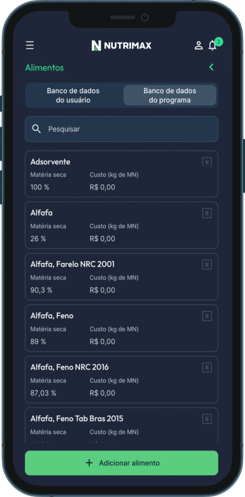 O NutriMax já vem com uma base atualizada de alimentos, contendo dados precisos de composição nutricional — incluindo energia metabolizável, proteína bruta, fibra, minerais e muito mais. Isso facilita a formulação de rações e suplementos com segurança e agilidade, mesmo para quem está começando.