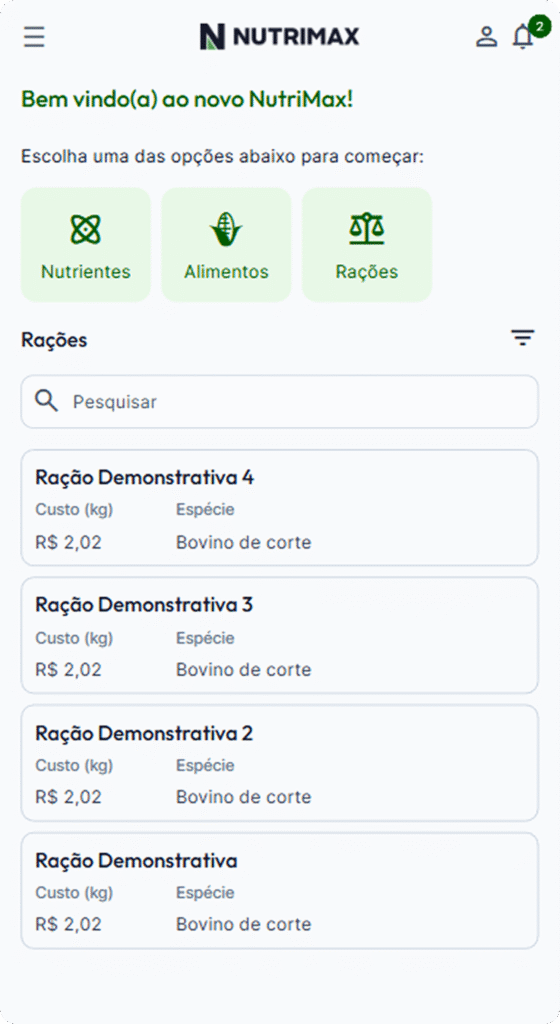 Crie fórmulas alinhadas às exigências nutricionais e fisiológicas de cada espécie e fase produtiva. Com o NutriMax, você garante desempenho, previsibilidade de resultados e eficiência operacional — tudo com agilidade e controle.
